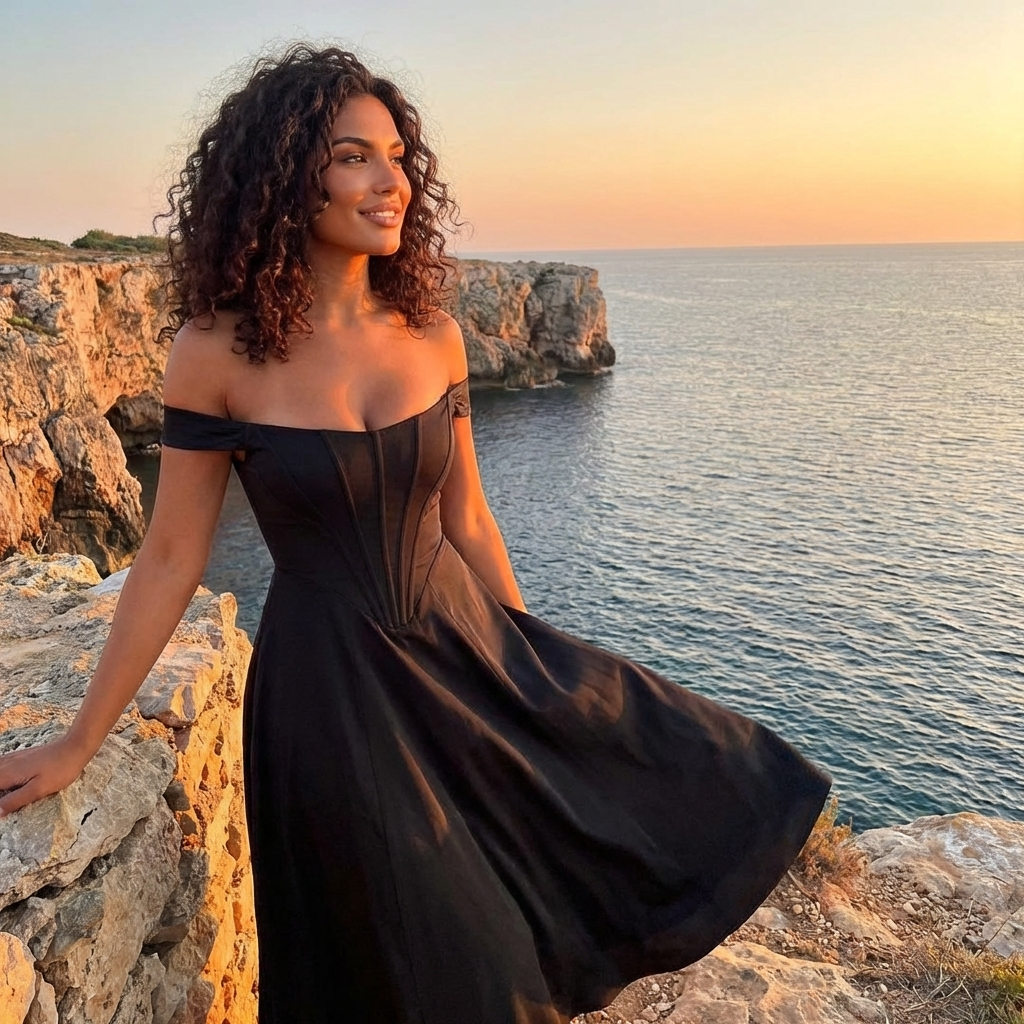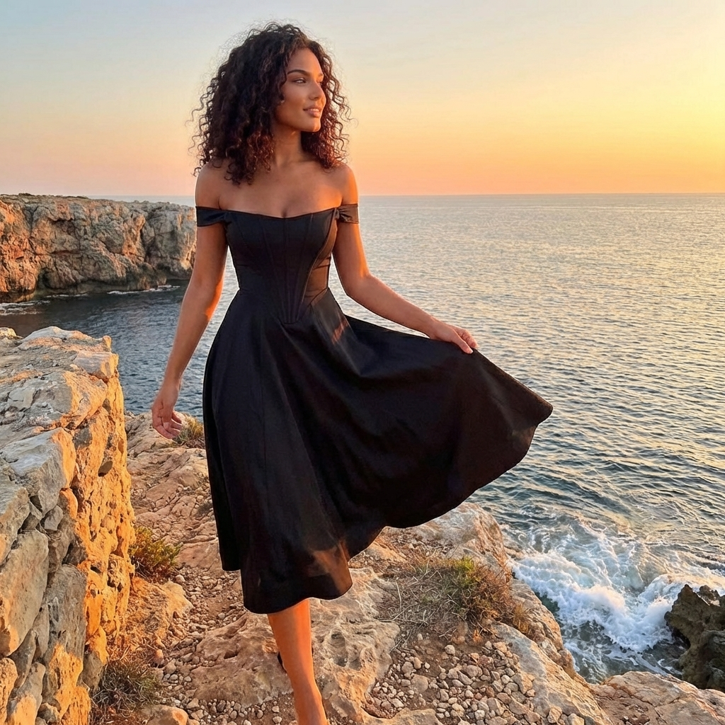Το βαθύ μαύρο χρώμα προσδίδει πολυτέλεια και διαχρονικότητα, καθιστώντας το ιδανικό για βραδινές εξόδους, επίσημες εκδηλώσεις ή κομψά καλοκαιρινά δείπνα δίπλα στη θάλασσα.